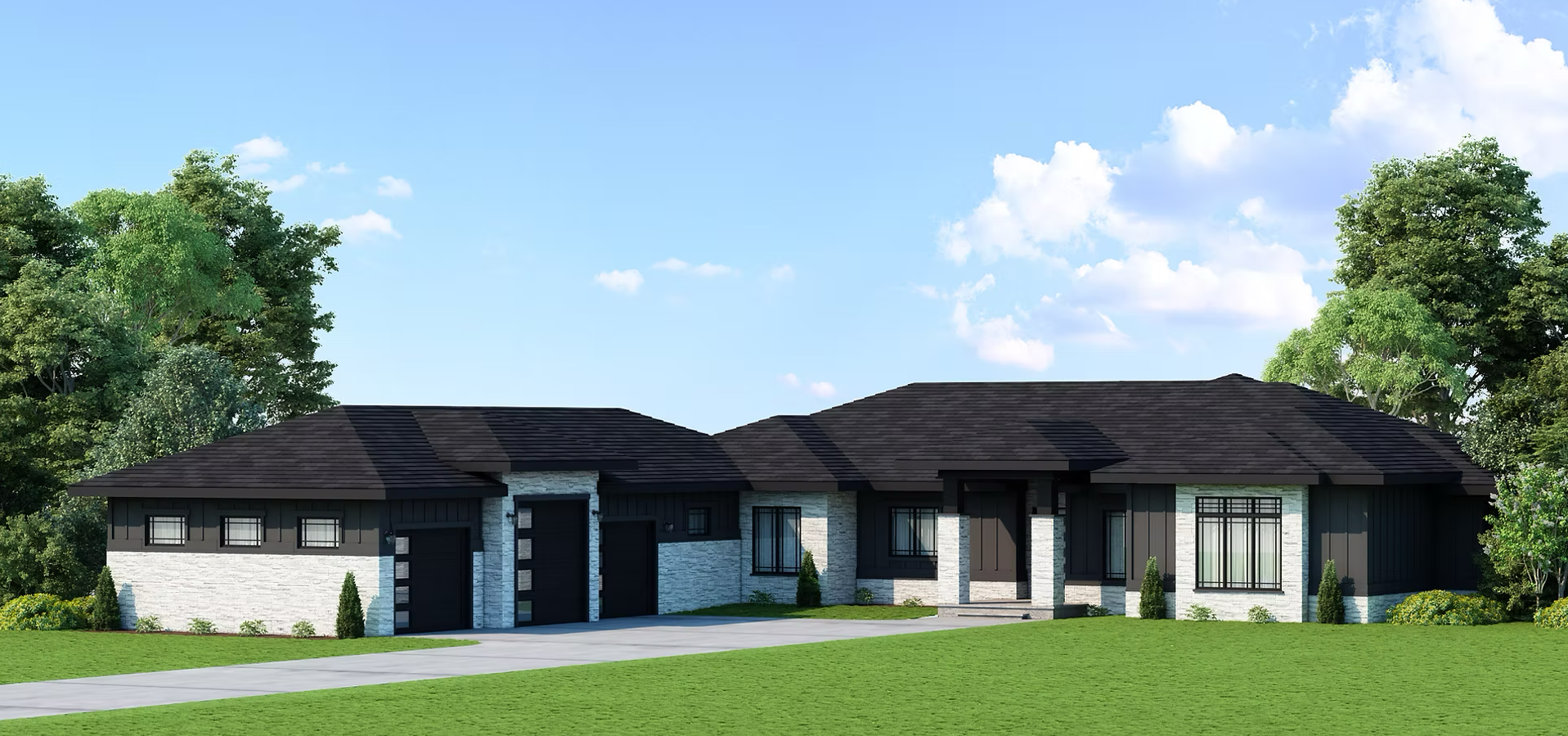 The exterior features black board and batten LP siding paired with natural white stone. Inside, the open layout highlights panoramic views and natural light throughout. The main floor includes two large bedrooms, a den, pocket office, and a separate office, ideal for remote work. The kitchen includes dual sinks and a walk-in pantry, plus a secondary prep kitchen for added convenience. The oversized three-car garage includes a rear workshop space for hobbies or storage.